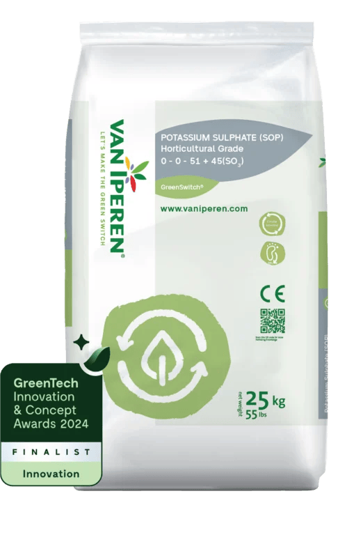 A GreenSwitch Potassium Sulphate (SOP)® is a premium, fully water-soluble potassium sulphate that is made with significantly reduced CO₂ emissions. It is suitable for foliar fertilization and nutrient solution irrigation and is manufactured by our industrial partner CINIS Fertilizer in Sweden.