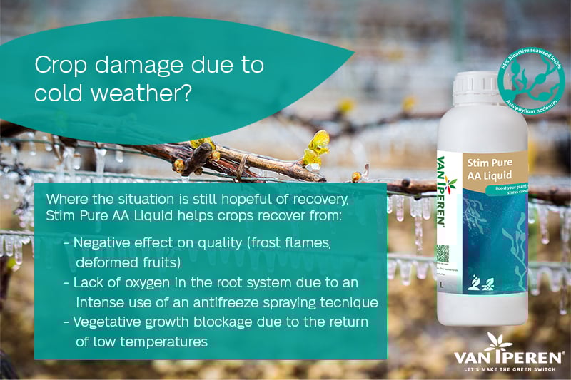 Where the situation is still hopeful of recovery, we recommend relaunching the plant with Stim Pure AA to cope with these conditions. As a biostimulant, Stim Pure AA will allow the plant to recover from these weather hazards by relaunching photosynthesis and activating cell division. We recommend 2 applications at 2 l/ha at 7-day intervals on all perennials crops.